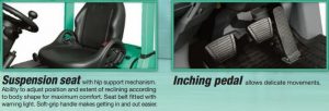 • Ghế ngồi của xe nâng Mitsubishi được thiết kế có lò xo giảm chấn và rãnh trượt điều chỉnh vị trí ngối giúp cho người điều khiển không bị mỏi mệt khi vận hành xe trong thời gian dài. Chỗ để chân được thiết kế theo tiêu chuẩn G7 giúp người vận hành linh hoạt trong công việc.
