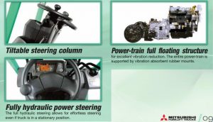 • Toàn bộ các chi tiết trên xe nâng của Mitsubishi đều được sản xuất đồng bộ và hoàn toàn của Mitsubishi